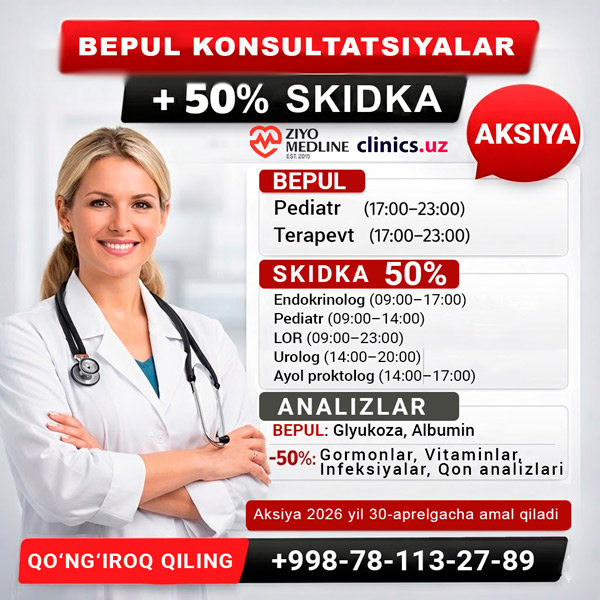 BEPUL konsultatsiyalar + ZIYO MEDLINE CLINIC da shifokorlar va analizlarga 50% skidka